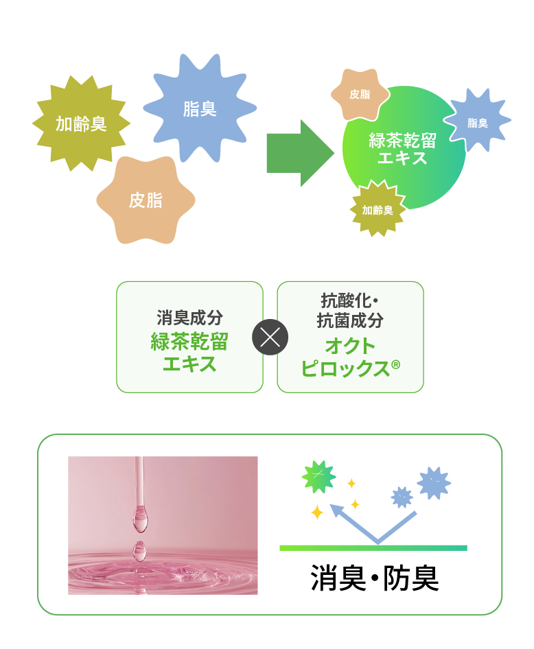 消臭成分緑茶乾留エキスが気になるニオイを吸着して洗浄。