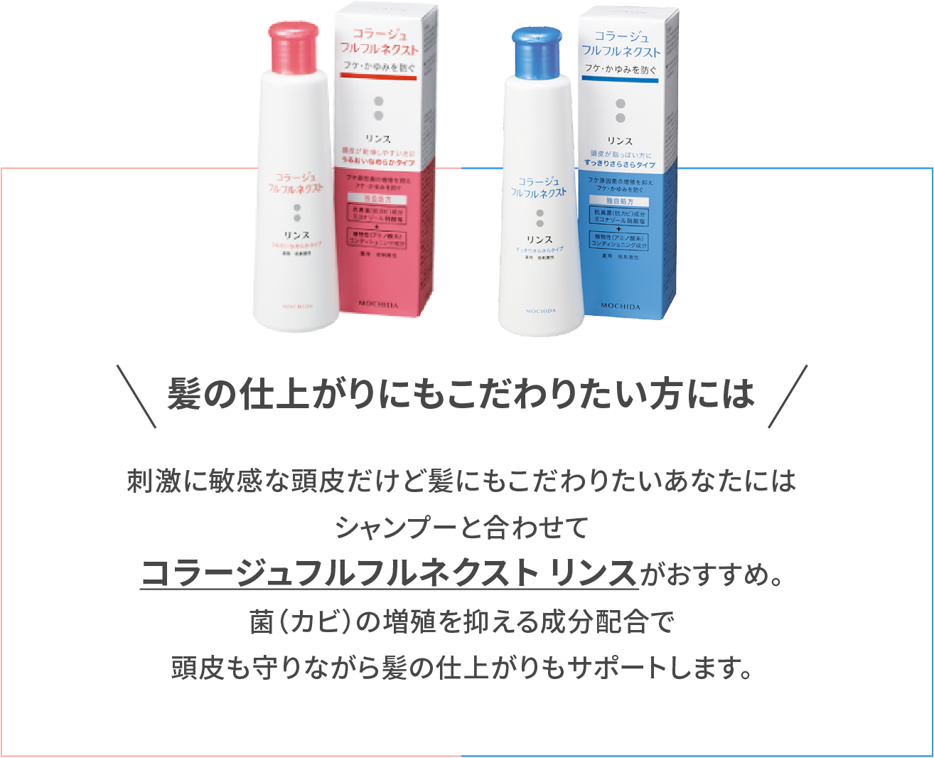 リンスはお好みでご使用いただいておりますが、かゆみ・フケを防ぐ効果をお求めの方には、ミコナゾール硝酸塩配合のリンスをお使いいただくことをおすすめします。